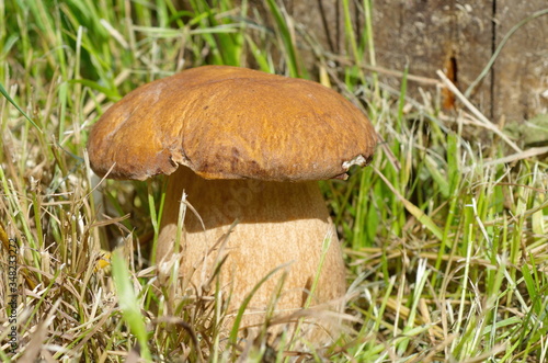 Porcini mushroom (lat. Boletus edulis) in the forest close-up