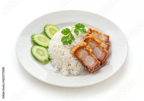pork meat, belly, jasmine, rice, garnished, cucumber, coriander, white, plate, food, studio, background, top, view, served, sliced, professional, clean, cookery, dish, meal, epicure, culinary, presentation, savoury, fresh, healthy, asian, dining, ingredient, appetising, traditional, favor, tasty, home, receipe, nourishment, lunch, dinner, platter, meat, green