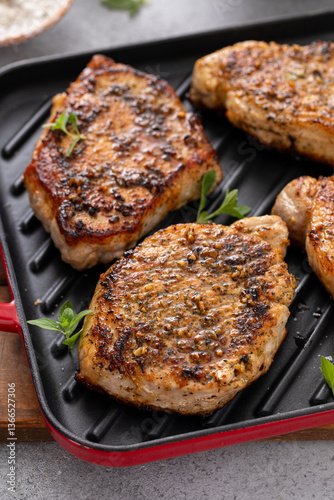 Pork chops with herbs and garlic grilled or sauteed on a pan
