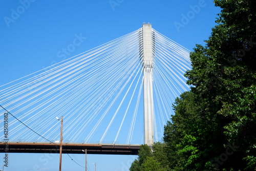 Port Mann bridge. Canada over Fraser River in BC interesting unusual footage of bridge from bottom up beautiful white cables stretched support mighty strong bridge green trees railroad Earth on siphon