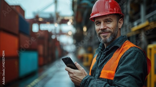 men at work, port, container, smartphone, technology, shipping, cargo, logistic, industry, dock, harbor, maritime, global, trade, commerce, business, man, male, adult, professional, occupation, employment, job, career, team, work, labor, construction, helmet, safety, uniform, vest, mobile, communication, connection, contact, digital, network, datum, transport, freight