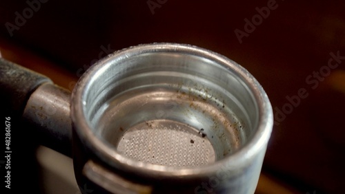 Portafilter. filter holder for coffee machine close-up of a barista placing an espresso holder in a professional coffee machine. early morning coffee shop