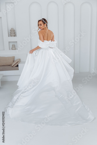 Porter from behind a young bride in a white trendy dress with a long train on a white background in the studio.