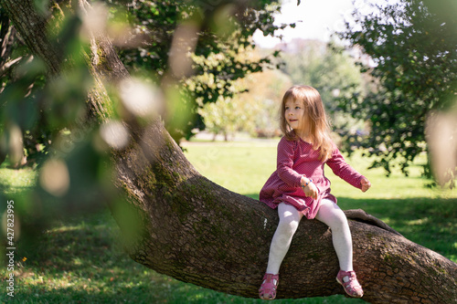 porter of a cute emotionally laughing little girl sitting on a thick tree branch