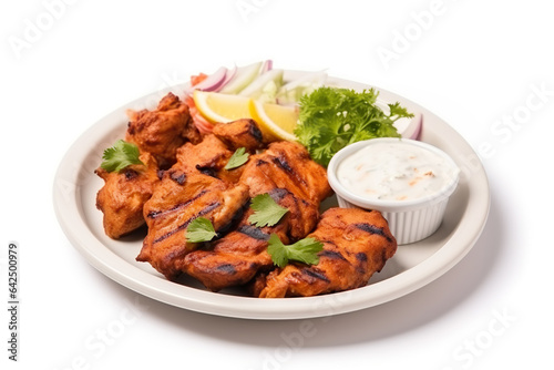 Portion of grilled chicken pieces, brazilian food, Souvlaki, Reshmi Chicken malai Tikka also known as Afghani murgh Malai Tikka, asian food, on white background.