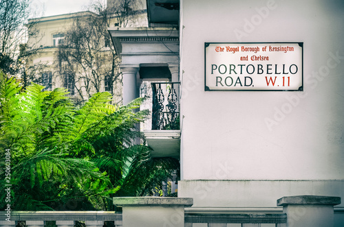 Portobello road street sign with plants and buildings in Notting Hill, London, England