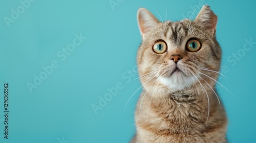 Portrait a funny shocked british short hair cat pet animal on blue background. AI generated image