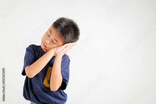 Portrait Asian young kid boy pretended emotions sleeping tired eyes closed dreaming with hands together near face, studio shot on white background, with copy space, insomnia concept, primary child