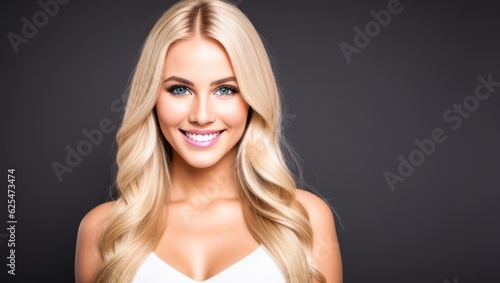 Portrait beautiful blonde model woman with white teeth smile, healthy long hair and beauty skin on dark background. Concept of advertising dentist and facial care. Generative AI