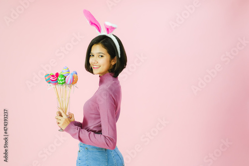 Portrait beautiful young asia girl with painted eggs, Happy easter day
