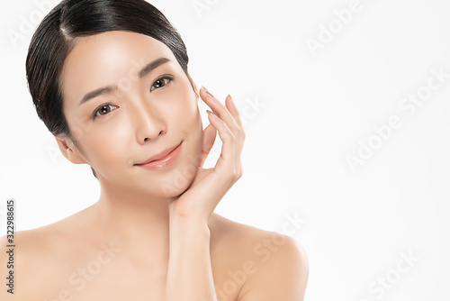 Portrait beautiful young asian woman clean fresh bare skin concept. Asian girl beauty face skincare and health wellness, Facial treatment, Perfect skin, Natural makeup, on white background,two