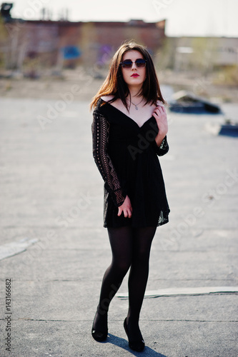 Portrait brunette girl with red lips wearing a black dress, tights and shoes on heels posed on the roof. Street fashion model.