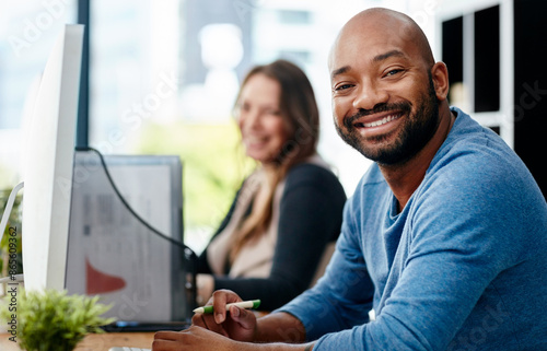portrait, businessman, smile, office, male, computer, technology, person, desk, professional, man, business, web, planning, happiness, career, research, electronic mail, administration, woman, people, happy, adult, smiling, working, work, goggles, table, together, design, creative, reading, online, men at work, information, confident, modern, job, designer, cyberspace, company, employee, startup, entrepreneur, confidence, workplace, staff