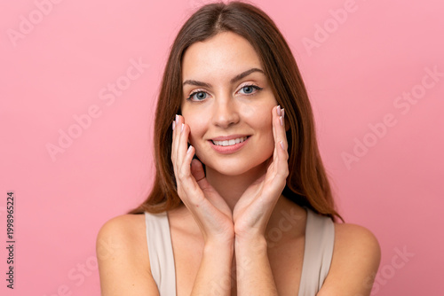 Portrait caucasian woman isolated on pink background . Portrait