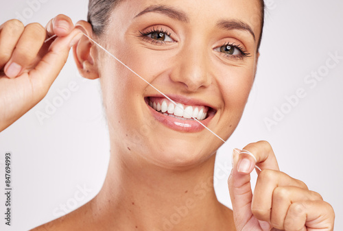 Portrait, hands of woman and dental floss in studio for healthy gums, teeth whitening or morning routine on white background. Oral care, wellness and model for fresh breath, remove plaque or hygiene