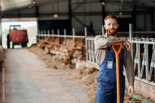 Portrait handsome young bearded farmer man in uniform against background of pen with cow. Concept worker of cattle livestock industry.
