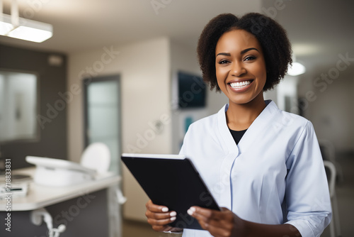 Portrait happy black female dentist using digital tablet and looking at camera.