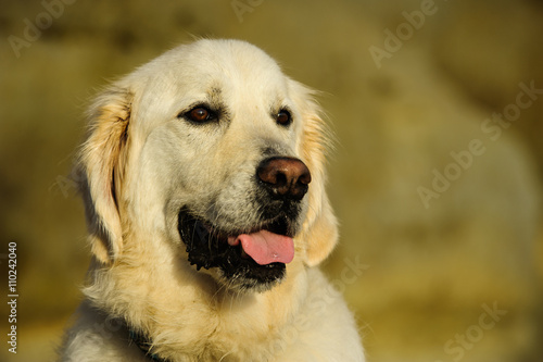 Portrait head shot of large Golden Retriever dog against neutral bluffs