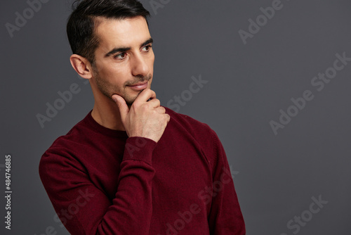 portrait man posing smile gesture hands red sweater cropped view