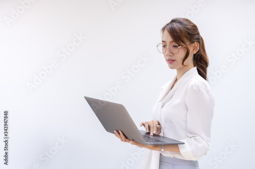 Portrait of business looking at laptop and workking in office. Young business colleagues discussing work in the office.