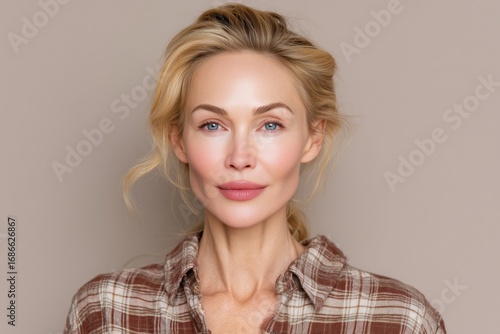 Portrait of 50 year old woman with blond hair in plaid shirt, natural beauty warm tones