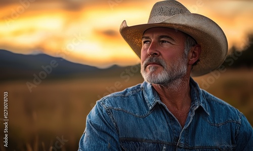 Portrait of a 50 Year Old Rancher in a Pasture at Sunset