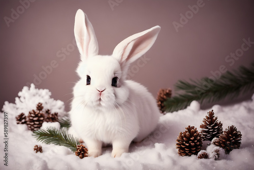 Portrait of a adorable bunny, funny and cute face closeup, wear a warming clothes in winter and ready for christmas. isolated on beautiful bokeh background, created with generative ai