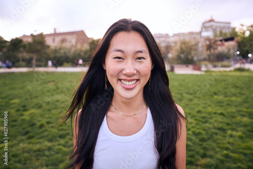 Portrait of a Asian woman looking at camera and smiling. Beautiful Chinese girl is happy and cute and is posing. She looks positive emotion and confident female posing outdoors with expression of joy