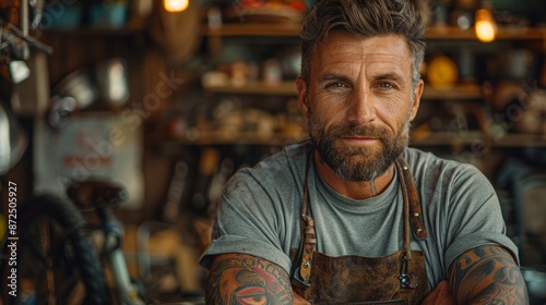 craftsman, workshop, portrait, bearded, tattoo, rugged, expertise, dedication, hand-made, skill, small business, branding, carpenter's shop, metalworking, authentic, artisan, tool, workspace, sharpened, closeup, man, mature, serious, industry, profession, workbench, equipment, craft, detail, expression, lifestyle, masculinity, creative, vintage, toolshed, professional, hobby, shopkeeper, meticulous, passion, artistic, genuine, hard-working, traditional