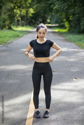 Portrait of a beautiful Asian woman in a black sportswear walking alone on the street after jogging in the morning. The athlete in a black is walking to warm up her body before jogging to get healthy.