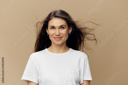 portrait of a beautiful attractive woman with long, beautiful, well-groomed hair blowing in the wind, stands smiling cutely at the camera on a beige background.
