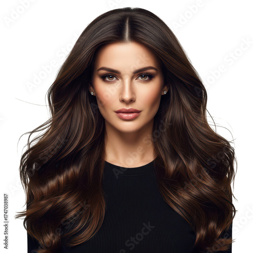 Portrait of a beautiful brunette woman with long, wavy hair isolated on transparent background she has a flawless complexion and is wearing a black top her hair is styled in loose waves