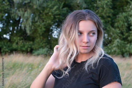 portrait of a beautiful European girl with loose hair against the background of nature