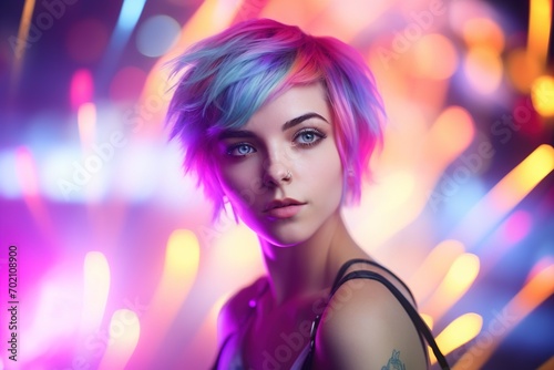 Portrait of a beautiful girl with short hair dancing in a nightclub