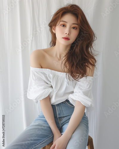 Portrait of a beautiful Korean woman wearing sleeveless white top and jeans in white background