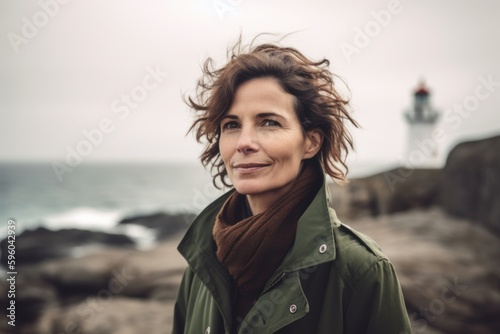 Portrait of a beautiful middle aged woman with curly hair, wearing a green coat and scarf, standing in front of a lighthouse, looking at the camera.