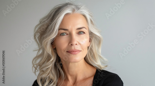 portrait of a beautiful middle-aged Caucasian woman with blond long hair, well-groomed facial skin, studio portrait white background.