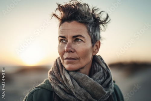 Portrait of a beautiful middle-aged woman in a green jacket and scarf on the beach.