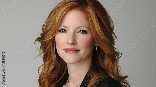 redhead, woman, female, portrait, face, closeup, beautiful, attractive, model, hair, long hair, red hair, ginger, auburn, wavy hair, curly hair, green eye, smiling, confident, elegant, professional, businesswoman, executive, corporate, stylish, fashion, beauty, make-up, grey background