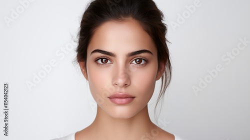 Portrait of a Beautiful Serious Brunette Woman With Natural Makeup and Soft Facial Features Against a Light Background, Ideal for Beauty and Fashion Projects