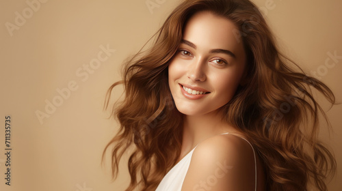 Portrait of a beautiful, sexy happy smiling woman with perfect skin and long hair, on a creamy beige background, banner.