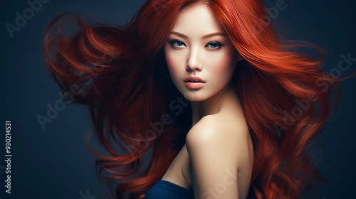 Portrait of a beautiful, sexy, smiling Asian woman with long red hair and perfect skin, dark blue background, banner.
