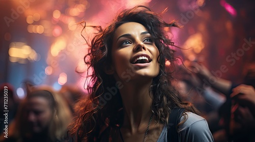 Portrait of a beautiful smiling laughing woman with curly hair in a nightclub