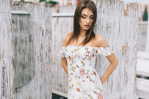 Portrait of a beautiful woman in a dress posing on a white wooden beach of summer.
