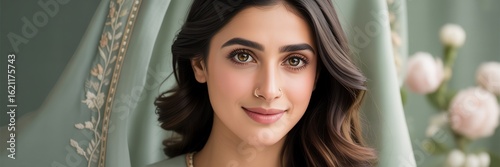Portrait of a beautiful woman with brown hair and eyes, wearing a nose ring and light makeup look