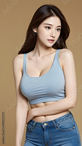 Portrait of a beautiful young Asian woman wearing blue top and jeans