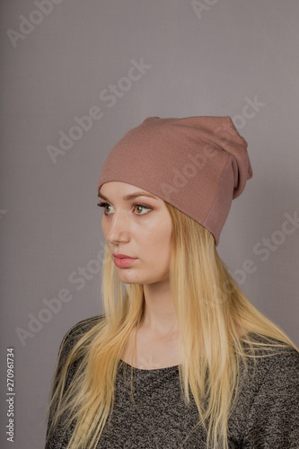 Portrait of a beautiful young girl in a stylish headdress with natural makeup on a gray background.