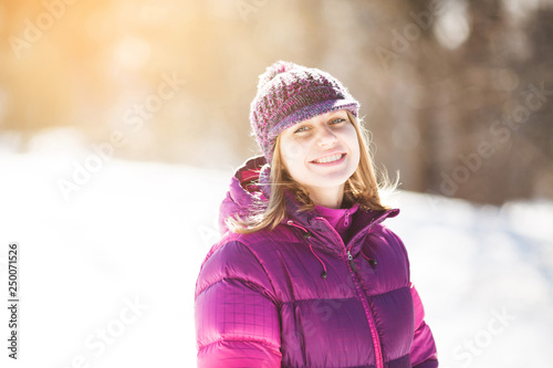 girl, woman, female, portrait, happiness, happy, beautiful, beauty, pretty, cute, cheerful, glad, joyfulness, joyful, gladness, smile, smiling, winter, snow, snowy, cold, coldness, coldly, forest, park, sunny, sunshine, nature, outdoors, season, weather, jacket, hat