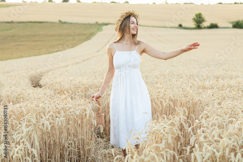 Portrait of a beautiful young woman in white dress and wreath of wheat ears in the field.