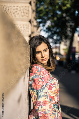 Portrait of a beautiful young woman outdoors in the city. Urban landscape. Travel and freelance lifestyle. Youth and beauty